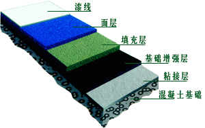 塑材软垫及丙烯酸涂面系统,其厚度约为3-4mm。内含百分百无机性纤维颜料,铺设在已冲洗干净值良好及排水斜度(1:100至1:150之内)的水泥或沥青地面基础上。